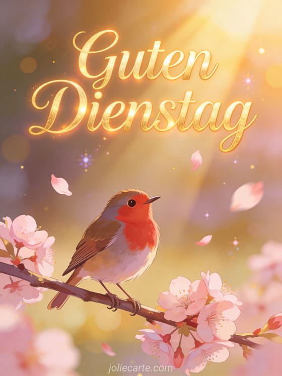 Verschönere den Dienstag von jemandem mit dieser wunderschönen Morgenkarte mit einem kleinen Rotkehlchen auf rosa Kirschblüten. Entdecke auch eine guten morgen lustiger dienstag oder eine guten dienstag regenbogen Karte.