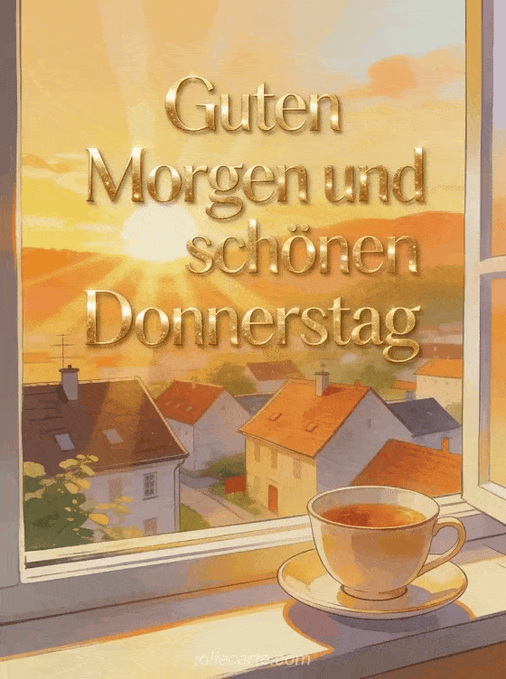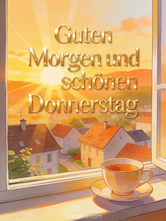 Teile Guten Morgen und schönen Donnerstag mit eleganter moderner Schrift, goldenem Glanz, Sonnenaufgang über Dorfhausdächern, einer Tasse auf dem Fensterbrett, sanften Strahlen und einer lebhaften Palette. Entdecke auch Donnerstag Küsschen Bilder, Schönen Donnerstag dicke Küsse gif oder schönen Donnerstag vor Weihnachten.