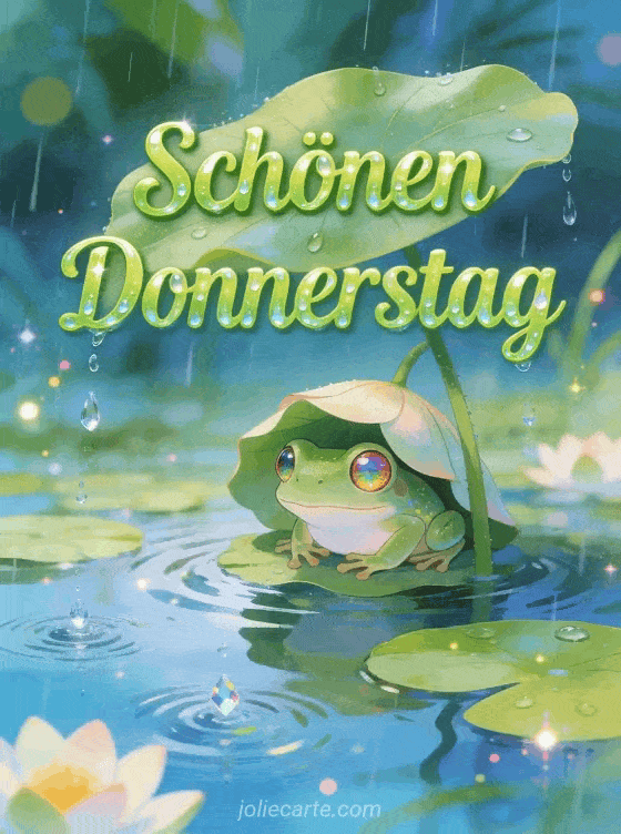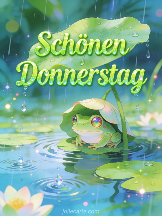 Schicke diese magische Guten-Morgen-Donnerstag-Karte mit einem kleinen Laubfrosch unter einem Lotusblatt im Regen. Entdecke auch eine Karte schöner Donnerstag große Küsse oder eine Karte schöner regnerischer Donnerstag.