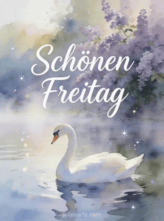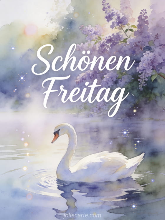 Starte den Freitag wunderschön mit dieser eleganten Karte mit einem anmutigen weißen Schwan auf einem morgendlichen Nebelsee. Entdecke auch freitag gif oder schönen freitagabend.