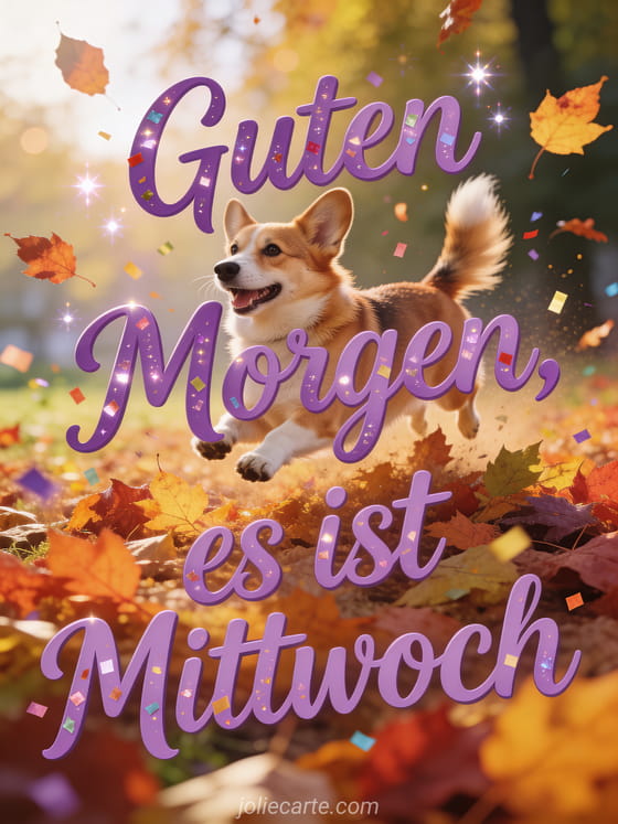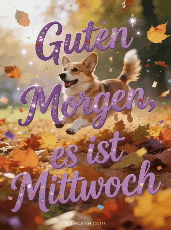 Sende einen fröhlichen Guten-Morgen-Gruß zum Mittwoch mit einem glücklichen Corgi, der durch buntes Herbstlaub in warmem Licht springt. Entdecke auch eine Guten Morgen meine Schöne Mittwoch, ein Guten Morgen schönen Mittwoch Bild oder Schönen Mittwoch Blumen GIFs.