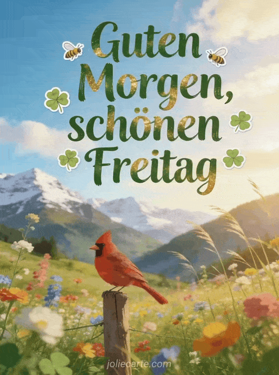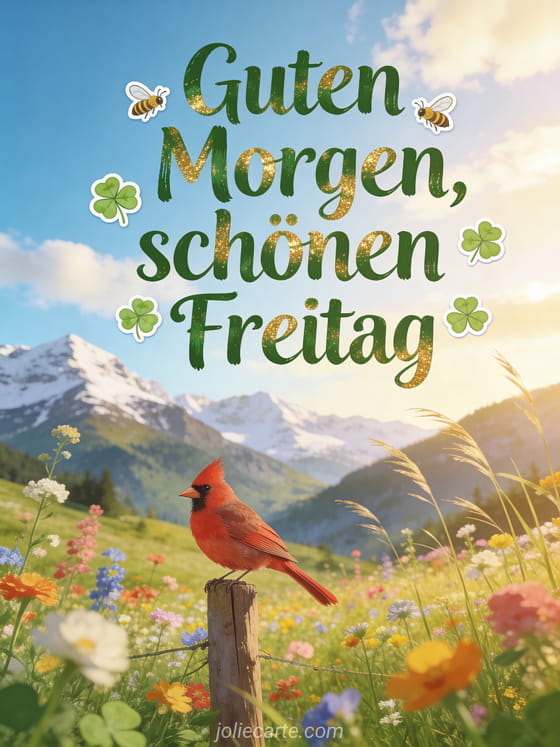 Sende einen leuchtenden Freitagmorgen-Gruß mit einem Alpental voller Wildblumen, schneebedeckten Gipfeln, goldenem Licht und einem roten Kardinal auf einem Holzpfosten. Entdecke auch Schönen Freitag Weihnachten, Schönen Freitag virtuelle Karten oder Schönen Freitag Tiere.