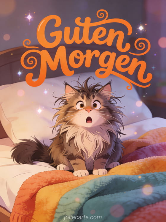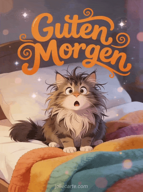 Teile einen verspielten Guten-Morgen-Gruß mit hüpfender orangefarbener Schrift, einer flauschigen Maine-Coon-Katze mit zerzaustem Fell und überrascht-lustigem Blick in einem gemütlichen Bett mit bunten Decken. Entdecke auch ein Landschafts-GIF zum schönen Freitag, eine Karte für schönen Tag am Freitag mit Küssen oder ein Guten-Morgen-Freitag-Bild.