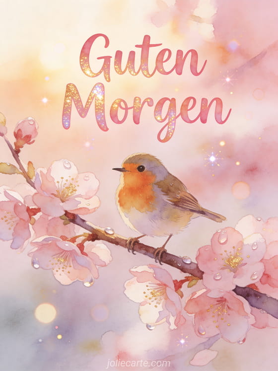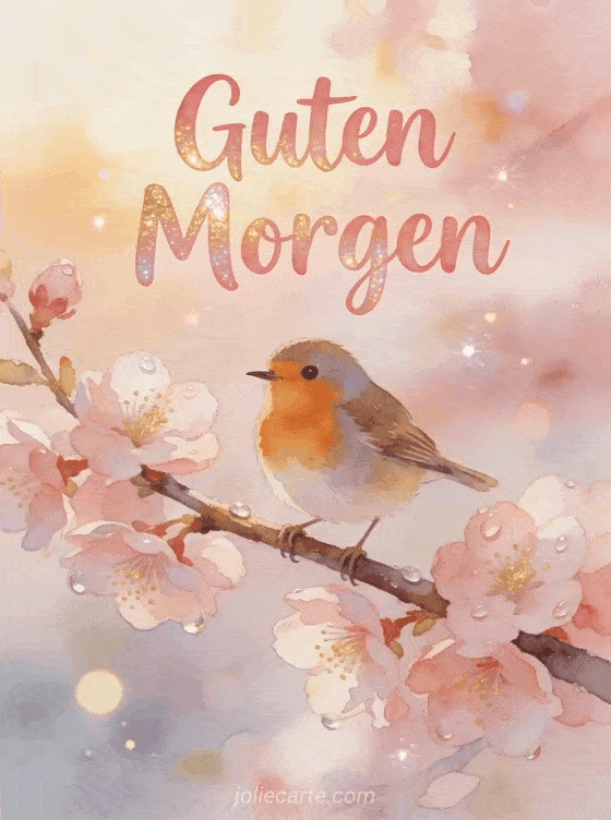Verschicke ein frisches und zartes Guten-Morgen-GIF mit einem niedlichen Rotkehlchen auf blühenden Kirschblüten und Morgentau. Entdecke auch eine Karte Guten Morgen GIFs, eine Karte Guten Morgen mein Schatz oder eine Karte Guten Morgen Schatz.