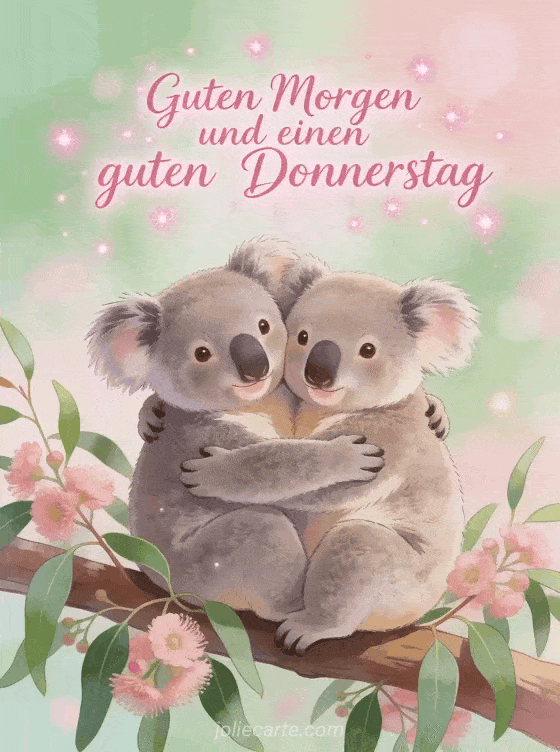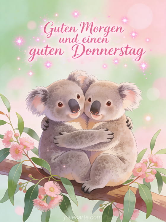 Verschönere jemandes Donnerstag mit dieser zärtlichen Karte mit zwei niedlichen Koalas, die auf Eukalyptuszweigen kuscheln. Entdecke auch Guten Morgen Donnerstag regnerisch oder schöner Donnerstag große Küsse.