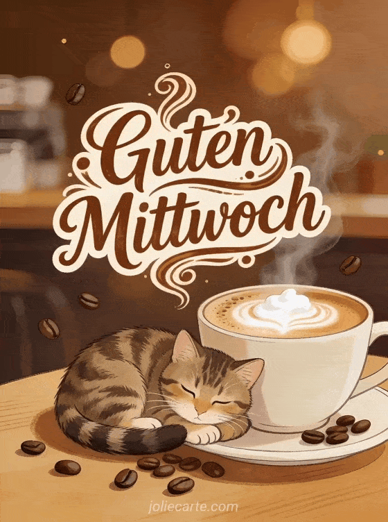 Guten Morgen guter Mittwoch Kaffee ein warmer und gemütlicher Mittwochmorgen-Gruß mit Kaffee und einer Katze