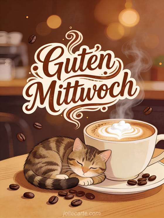Verschönere jemandes Mittwoch mit dieser warmen Kaffee-Karte mit einer süßen getigerten Katze neben einer Latte-Tasse. Entdecke auch Emoji schönen Mittwoch oder Mittwoch Küsse Gifs.