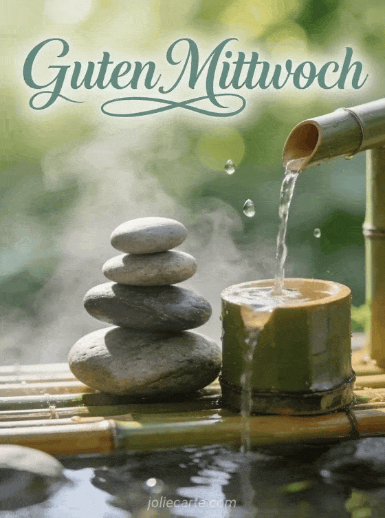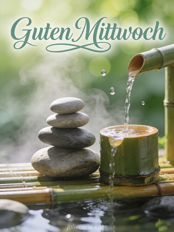 Teile einen besinnlichen Mittwochsmorgengruß mit dieser friedlichen Karte mit Zen-Steinen im perfekten Gleichgewicht und einem Bambusbrunnen. Entdecke auch sonniger mittwoch bild oder guten mittwoch januar für mehr Mittwochsinspiration.