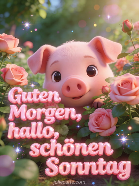 Teile Guten Morgen hallo schönen Sonntag mit verspielter rosa Schrift, einem niedlichen Cartoon-Schweinchen, das hinter Blumen hervorschaut, einem schüchternen freundlichen Ausdruck, Rosen und Gartenstimmung. Entdecke auch schönen Sonntag Kaffee GIF oder Schönen Sonntag Katze Humor.