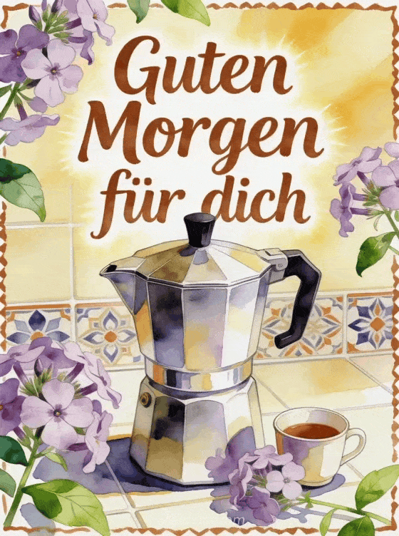 Teile eine warme Guten-Morgen-Kaffeekarte mit einer polierten Mokkakanne, einer kleinen Tasse, Phloxblüten und gemusterten Küchenfliesen im goldenen Licht. Du kannst auch ein Guten Morgen Kaffee Blumen Bild, ein Guten-Morgen-Kaffee-Bild oder ein Guten Morgen mit Kaffee animiertes GIF senden.