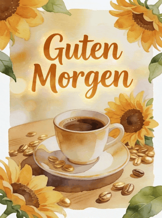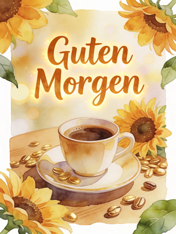 Teile Guten Morgen mit karamellfarbener Schrift, einer kleinen Espressotasse auf einer Untertasse, Sonnenblumen und goldenen Kaffeebohnen auf einem hellen Frühstückstisch. Entdecke auch schönes Guten Morgen Kaffee Bild, Guten Morgen guter Kaffee am Morgen oder schönes Guten-Morgen-Kaffee-Bild.