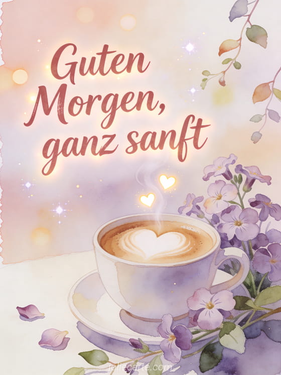 Teile einen sanften guten Morgen mit einer Latte-Tasse, herzförmigem Schaum, Blaukissenblüten und leuchtenden Herzen im Kaffeedampf. Du kannst auch eine Guten Morgen Kaffee Nachricht, ein bild guten morgen guter kaffee oder ein guten morgen animiertes gif dampfender kaffee senden.