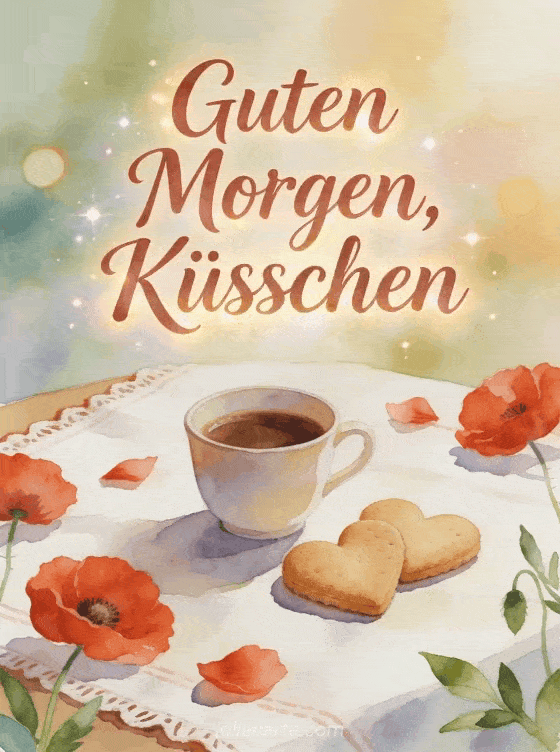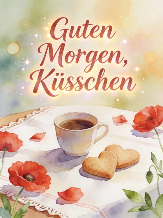 Teile einen warmen Guten-Morgen-Gruß mit einer Kaffeetasse, herzförmigen Keksen und roten Mohnblumen in sanftem Aquarelllicht. Dazu passen auch ein Guten Morgen Kaffee Herz GIF, eine Guten Morgen Kaffee Nachricht oder ein bild guten morgen guter kaffee.
