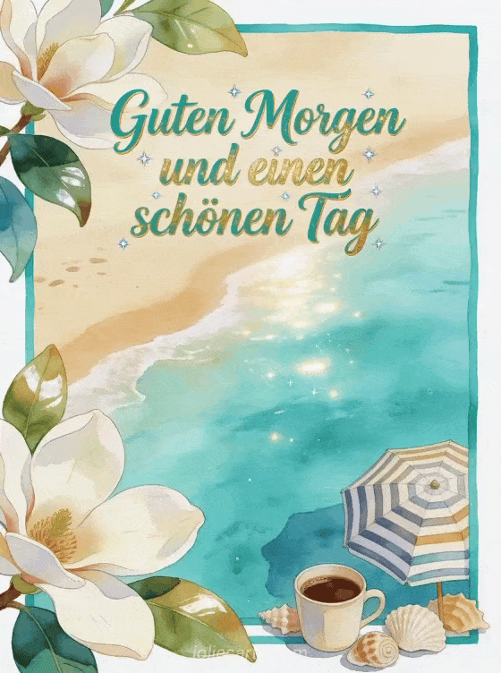 Beginne den Tag mit blaugrüner und goldener Schrift, Magnolienblättern über dem Rand und einer Kaffeetasse neben Muscheln nahe einem gestreiften Sonnenschirm. Dazu passen auch Guten Morgen Kaffee Küsse, Guten Morgen Kaffee Croissant oder Foto Guten Morgen guter Kaffee.