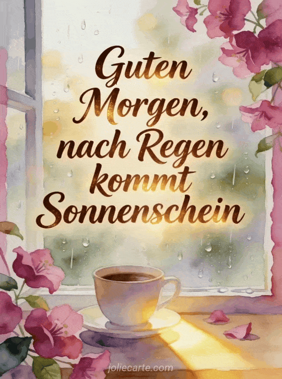 Teile einen hoffnungsvollen Morgengedanken mit einer Kaffeetasse am regennassen Fenster, leuchtenden Fuchsienblüten und einem warmen Sonnenstrahl auf dem Tisch. Dazu passen ein glitzerndes Guten-Morgen-Kaffee-GIF, Kaffee Guten Morgen mein Schatz oder ein kostenloses Guten Morgen Kaffee Bild.