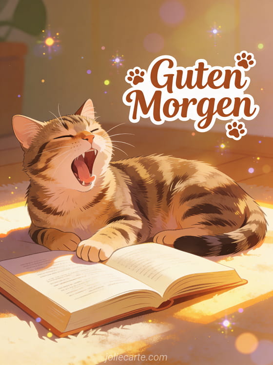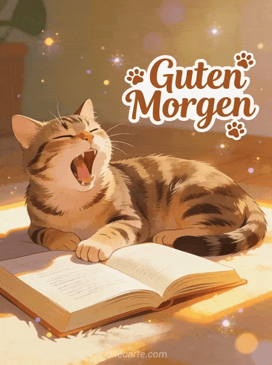 Starten Sie den Tag mit einem Lächeln mit diesem entzückenden Guten Morgen Gruß mit Katze voller Gemütlichkeit. Entdecken Sie auch animierter guten Morgen, einen schönen Morgen oder lustiger guten Morgen.