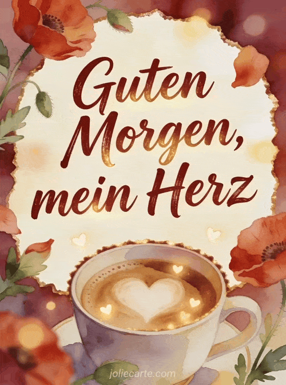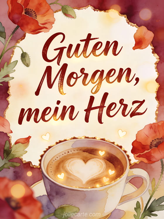 Teile einen liebevollen Morgenmoment mit dieser Aquarellkarte, mit einer Kaffeetasse mit herzförmigem Schaum, Mohnblüten, Blättern und kleinen leuchtenden Herzen. Entdecke auch Guten Morgen Kaffee Kaffee, Guten-Morgen-Kaffee-GIFs oder Guten Morgen Kaffee Zärtlichkeit.