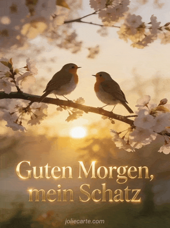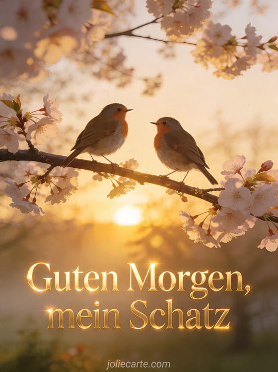 Teilen Sie eine liebevolle Fernbotschaft mit dieser kostenlosen Guten-Morgen-Karte mit zwei Rotkehlchen, Kirschblüten und sanftem Morgenlicht. Entdecken Sie auch Zitat Sehnsucht Liebe Distanz, Nachricht Liebe auf Distanz oder schöne Karte Liebe auf Distanz.