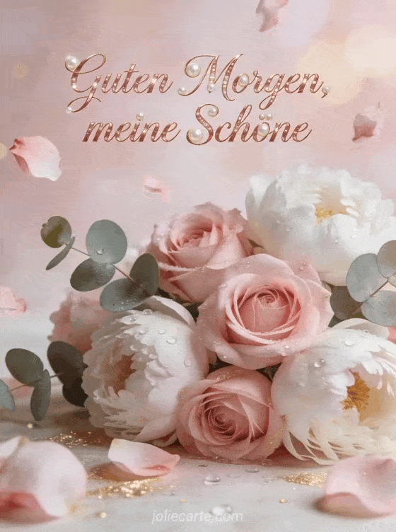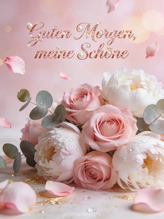 Senden Sie einen liebevollen Guten-Morgen-Gruß mit zarten rosa Rosen, weißen Pfingstrosen, Eukalyptus und Morgentau. Entdecken Sie auch Guten Morgen schönen Mittwoch Bild, Schönen Mittwoch Blumen GIFs oder Guten Morgen Guten Morgen Schönen Mittwoch Bild.