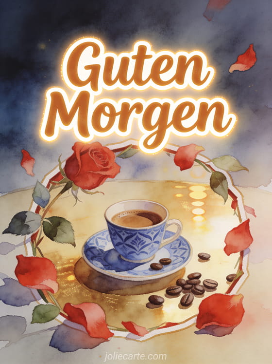 Sende eine herzliche Karte für Guten Morgen mit einem Kaffee, abgerundetem Karamellschriftzug, roten Rosenblättern, einer Espressotasse auf einer blau gemusterten Untertasse und verstreuten Kaffeebohnen. Du kannst auch Milchkaffee Guten Morgen, Guten Morgen Kaffee Lächeln oder gif guten morgen kaffee croissant teilen.