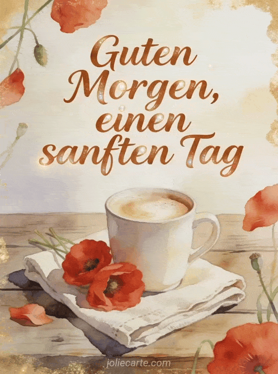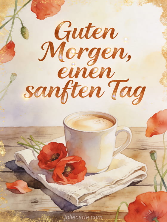 Teile einen sanften Guten Morgen mit einer cremigen Cappuccino-Tasse, roten Mohnblumen, einer gefalteten Leinenserviette und einem rustikalen Holztisch. Entdecke auch Guten Morgen guter Kaffee GIF, Guten Morgen mein Herz Kaffee oder Guten Morgen Kaffee Kaffee.
