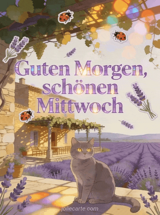 Teile einen wunderschönen Mittwochsgruß am Morgen mit Lavendelfeldern, einem provenzalischen Bauernhaus und einer eleganten Kartäuserkatze. Entdecke auch picmix schönen mittwoch bilder, animiertes gif bild schönen mittwoch und zärtlichkeit bild schönen mittwoch küsschen.