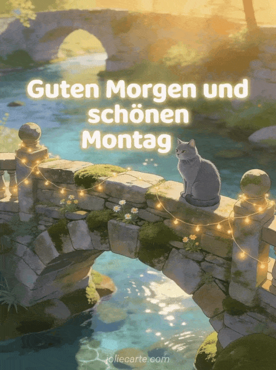 Beginne den Montag mit Wärme dank dieser zauberhaften Karte mit einer eleganten Kartäuserkatze auf einer alten Steinbrücke über einem klaren Fluss, Lichtergirlanden und Wildblumen. Entdecke auch bild schönen montag küsschen, bild schönen montag und gute woche oder kaffee schönen montag humor.