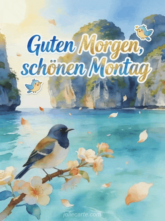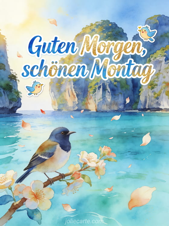 Verschicke einen leuchtenden Gruß für guten Morgen und schönen Montag mit blauer Aquarellschrift, goldenen Akzenten, fröhlichen Vögeln, schwebenden Blütenblättern, türkisfarbenem Phi-Phi-Wasser und einem Gimpel auf einem blühenden Zweig. Dazu passen auch dieser Guten Morgen schönen Montag Kaffee, dieses schönen Montag gute Woche GIF oder dieses schönen Montag Kaffee Bild.