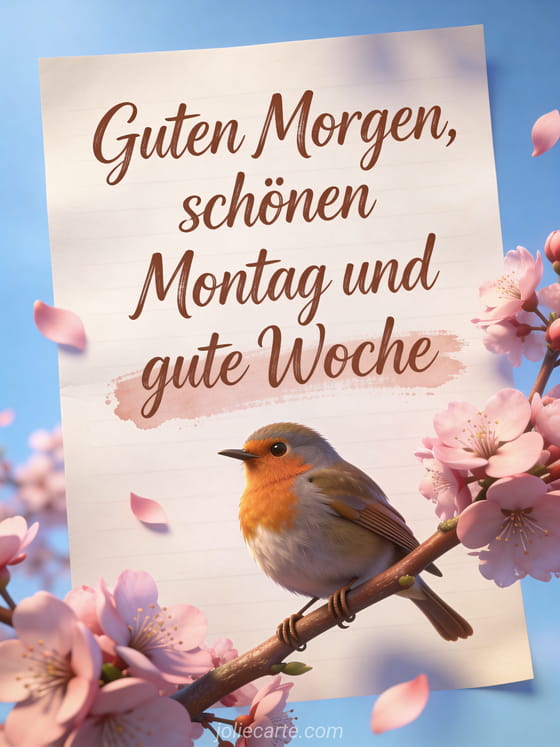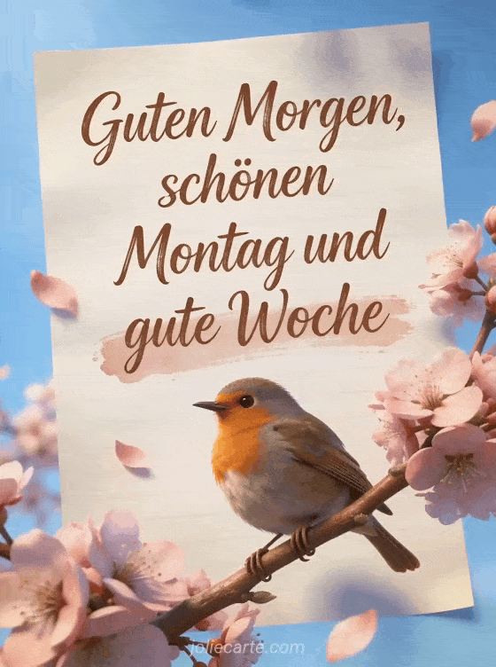 Sende herzliche Wünsche für einen guten Morgen, schönen Montag und eine gute Woche mit dieser poetischen Karte mit einem Rotkehlchen auf einem blühenden Kirschbaumzweig. Entdecke auch hübsche Karte guter Montag oder guten montagabend.