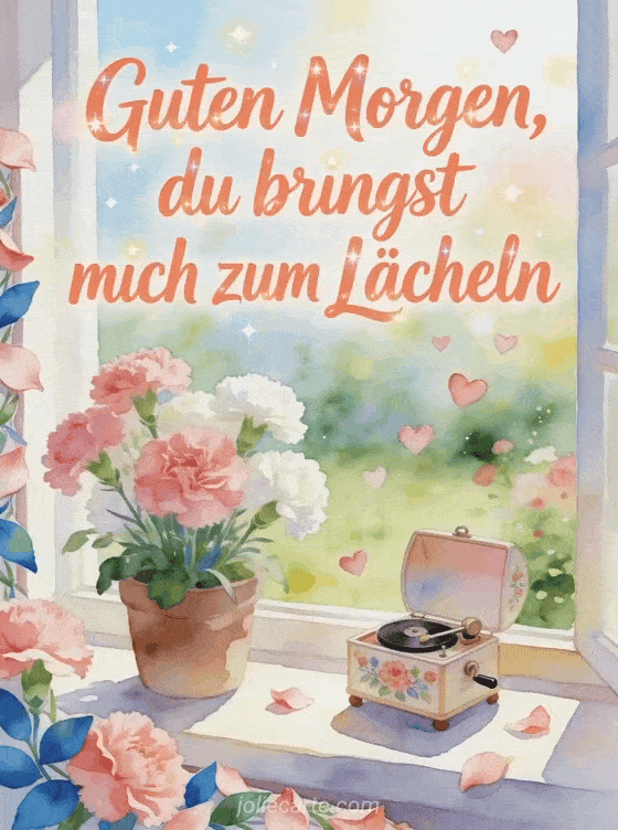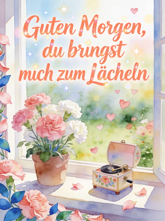 Sende eine fröhliche Guten Morgen Nachricht an deinen Crush mit korallfarbener Aquarellschrift, Nelken, einer kleinen Spieluhr und herzförmigem Konfetti. Entdecke auch Guten Morgen Nachricht fĂŒr meine Schöne, berĂŒhrende guten morgen nachricht oder witziges Guten Morgen GIF.