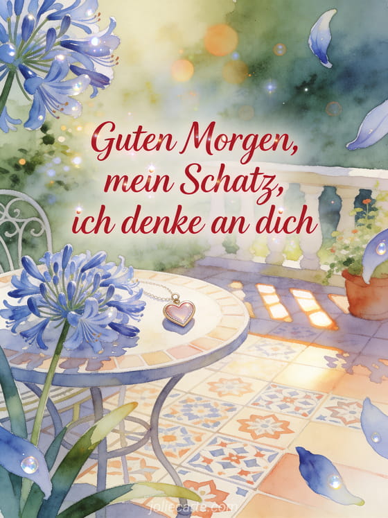 Sende eine romantische Guten-Morgen-Karte mit zärtlichem karmesinrotem Aquarellschriftzug, einem gemütlichen Gartentisch, blauen Agapanthusblüten, einem kleinen herzförmigen Medaillon und gemusterten Fliesen. Entdecke auch eine virtuelle Guten-Morgen-Karte, eine Guten Morgen Nachricht für meinen Mann oder eine Guten-Morgen-Nachricht an einen Freund.