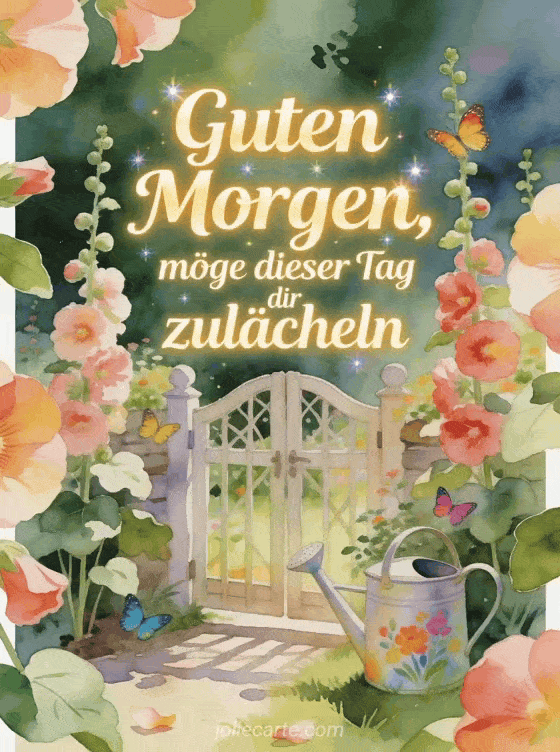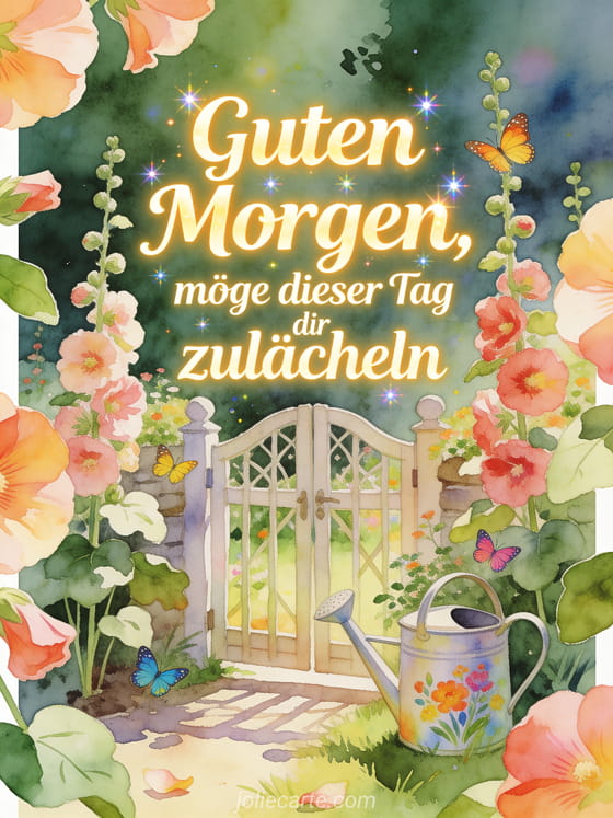 Sende eine fröhliche Guten-Morgen-Karte mit sonnig ockerfarbenem Aquarellschriftzug, einem hĂŒbschen Gartentor zwischen Stockrosen, einer bemalten GieĂkanne und leuchtenden Schmetterlingen. Entdecke auch Guten-Morgen-Karten fĂŒr Freunde, eine Guten Morgen Nachricht fĂŒr meine Frau oder eine schöne Guten-Morgen-Nachricht.