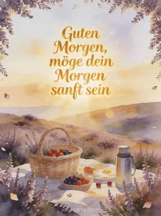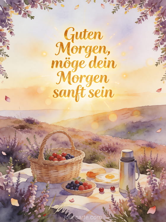 Sende eine beruhigende Guten-Morgen-Nachricht für den Morgen mit honiggoldener Aquarellschrift, einem Heidehügel, einem Weidenkorb, Beeren und einer kleinen Thermosflasche. Entdecke auch animierte Guten-Morgen-Karten, virtuelle Guten Morgen für dich Karte oder besondere Person Morgen Guten Morgen Nachricht.