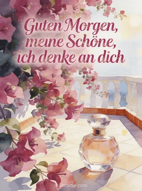Sende eine romantische Guten Morgen Nachricht für meine Schöne mit eleganter Aquarellschrift, einem Parfumflakon und leuchtender Bougainvillea. Entdecke auch Guten Morgen Nachricht an ihren Mann, guten morgen gif oder guten morgen lustig gif.