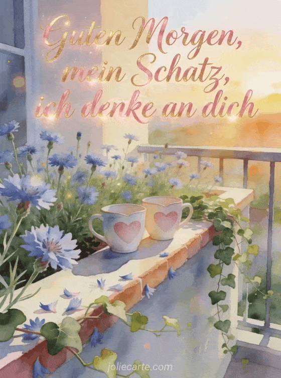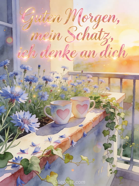 Sende eine zärtliche Guten-Morgen-Karte mit roségoldenem Aquarellschriftzug, einem Balkongarten bei Sonnenaufgang, Kornblumen, Efeu und zwei herzförmigen Keramikbechern. Entdecke auch eine Guten-Morgen-Nachricht an einen Freund, eine Guten-Morgen-Nachricht für den Morgen oder animierte Guten-Morgen-Karten.