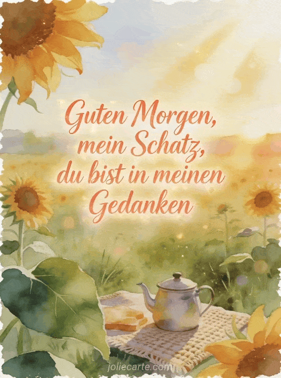 Senden Sie eine Guten Morgen Nachricht für seine Frau mit einer strahlenden Karte voller Sonnenaufgangswärme, Sonnenblumen und liebevoller Zärtlichkeit. Teilen Sie auch Sumpfblumen, eine Guten-Morgen-Karte oder morgen guten morgen.