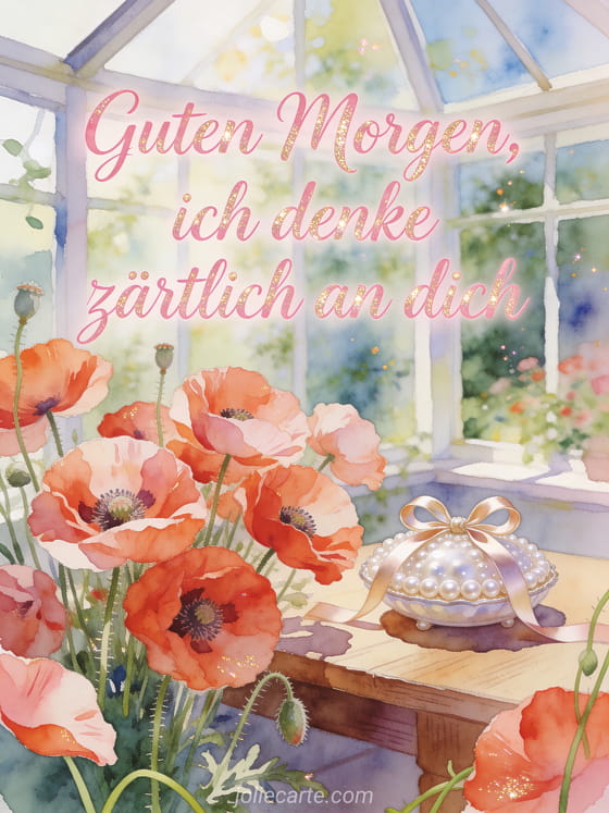 Sende eine poetische Guten-Morgen-Nachricht für sie mit zarter rosafarbener Aquarellschrift, Mohnblumen, einer perligen Schmuckschale und Satinschleifen in einer hellen Veranda. Entdecke auch Guten Morgen Nachricht an eine Freundin, blumige Guten-Morgen-Karte oder schöne kostenlose virtuelle Guten-Morgen-Karte.