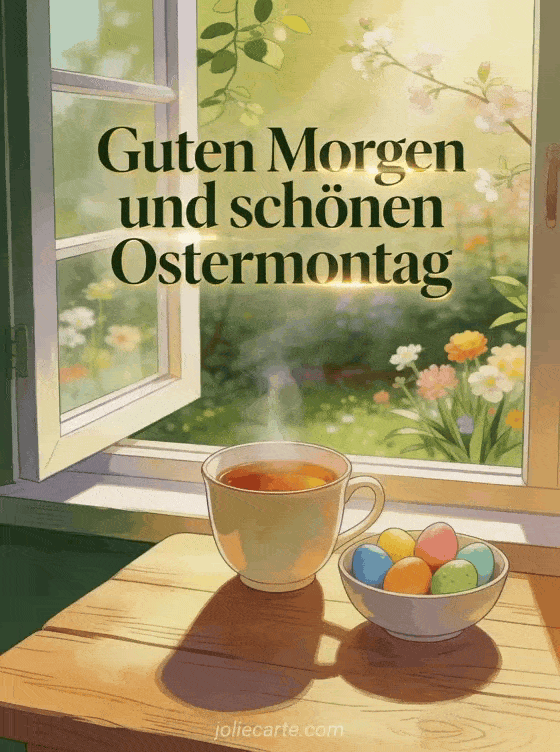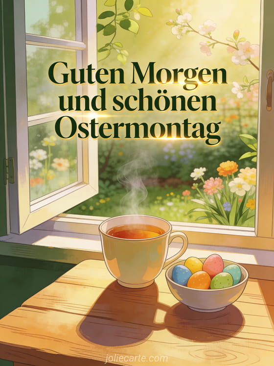 Wünschen Sie einen guten Morgen und schönen Ostermontag mit dieser gemütlichen Karte mit dampfender Teetasse, bunten Ostereiern und Blick auf einen Frühlingsgarten. Entdecken Sie auch eine Osterwochenende-Karte, Osterwochenende-Grüße oder Osterwochenende-Karte.