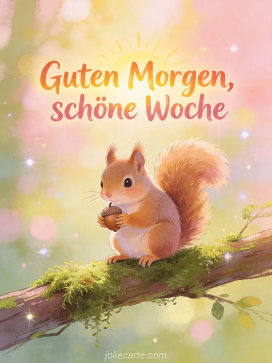 Guten Morgen, schöne Woche ein frischer Wochenwunsch mit einem süßen Eichhörnchen im Wald