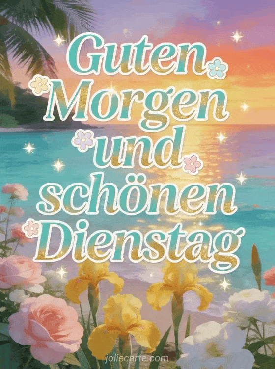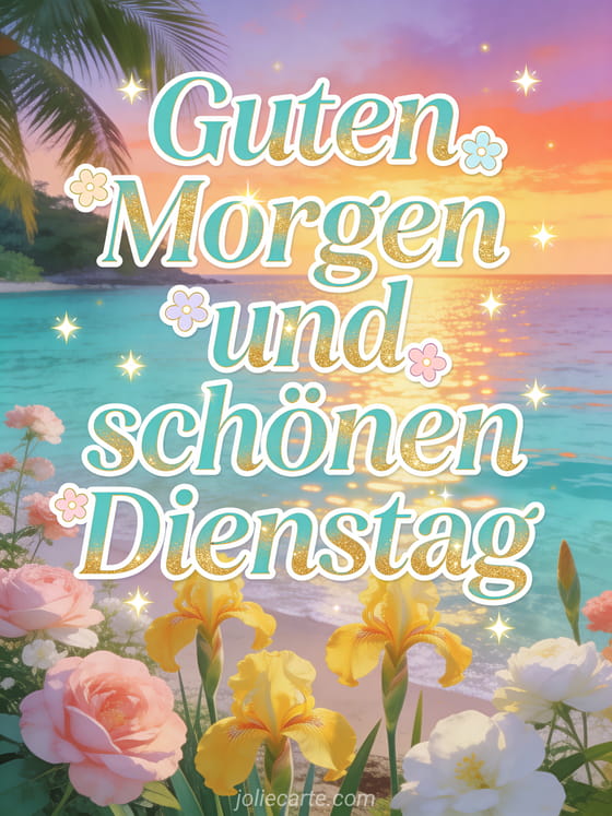 Verschicke einen sanften Gruß für guten Morgen und schönen Dienstag mit türkisfarbener Schrift, goldenen Akzenten, Pastellblumen, leuchtenden Sternen, einer türkisfarbenen Bucht in korall-violetter Dämmerung und gelben Iris am ruhigen Meer. Dazu passen auch diese Schönen Dienstag Karte, dieses lustiges Schönen-Dienstag-Bild Humor oder dieses Schönen Dienstag Bild.