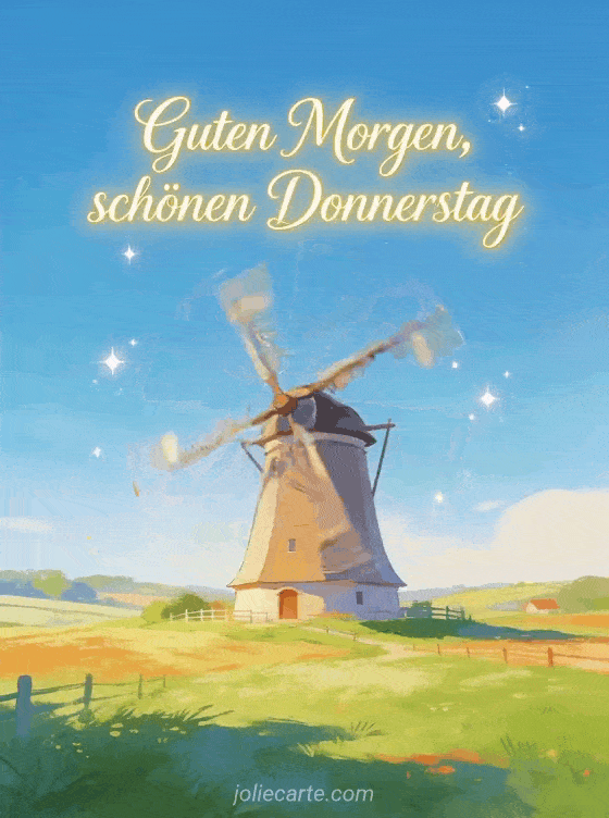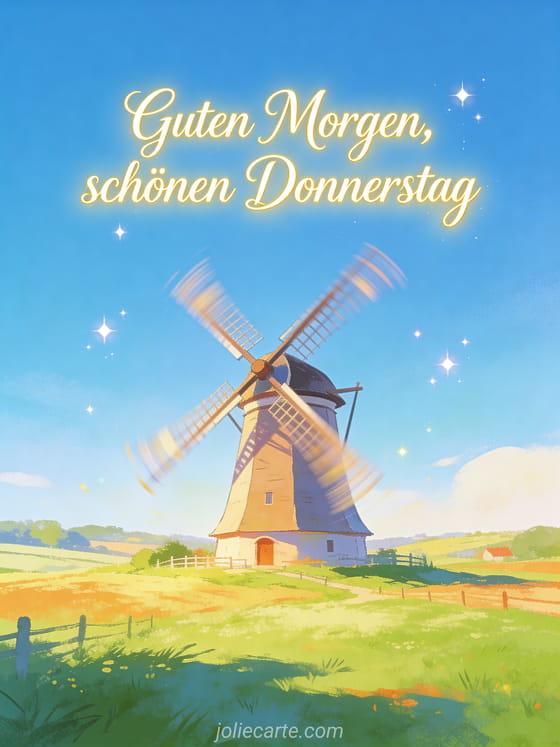 Teile Guten Morgen, schönen Donnerstag mit eleganter Kalligrafie, sanftem Halo, farbenfrohem Land, einer drehenden Mühle unter klarem blauem Himmel, zartem Funkeln und frischer Stimmung. Entdecke auch Guten Morgen schönen Donnerstag Küsse Bilder, schönen Donnerstag Lächeln oder animierte Schönen-Donnerstag-Karte.