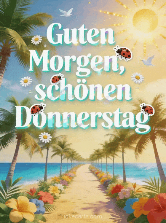 Verschicke einen leuchtenden Gruß für guten Morgen und schönen Donnerstag mit weißer Schrift, türkisfarbenen Reflexen, Marienkäfern, Margeriten, einem Palmenweg am azurblauen Meer, goldenem Sand und tropischen Blumen unter strahlender Sonne. Dazu passen auch diese kostenlose Karte schönen Donnerstag, dieses Schönen Donnerstag wünschen Bild oder dieser schönen Tag Donnerstag.