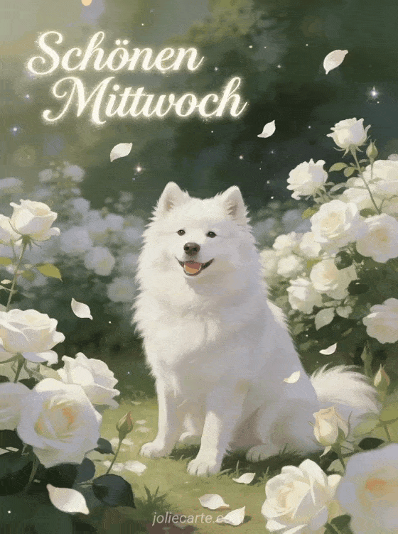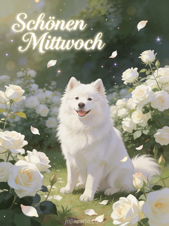 Senden Sie einen eleganten Gruß zum schönen Mittwoch mit einem flauschigen weißen Samojeden in einem Garten voller weißer Rosen. Entdecken Sie auch animierter Hund Kuss GIF Schönen Mittwoch, Schönen Mittwoch Text oder schönen Mittwoch kostenloses Bild.