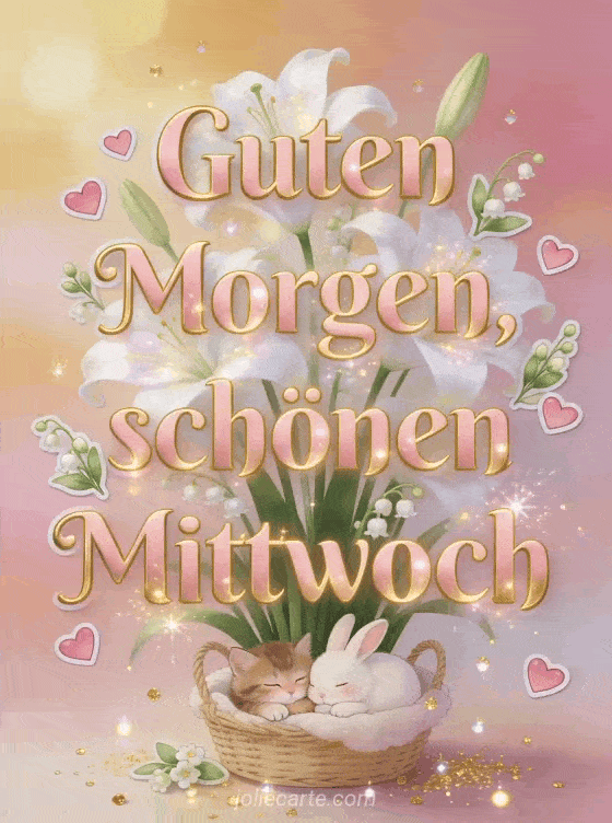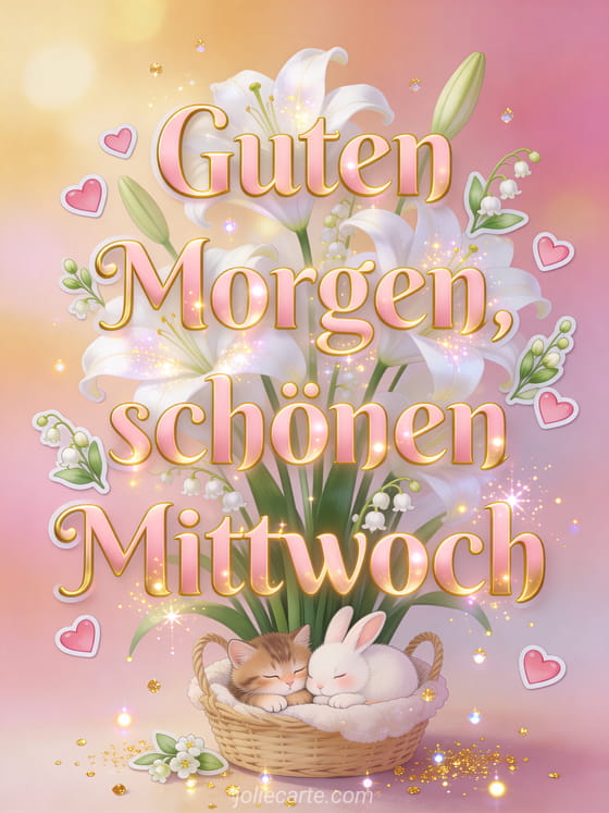 Teilen Sie eine sanfte Karte zu guten Morgen schönen Mittwoch mit roségoldener Schrift, rosa Herzen, Maiglöckchen, majestätischen weißen Lilien und einem Kätzchen, das mit einem Hasen in einem gemütlichen Korb schläft. Entdecken Sie auch Schönen Mittwoch Blumen GIFs, dieses Guten Morgen Guten Morgen Schönen Mittwoch Bild oder diese Schönen Mittwoch Fotos.