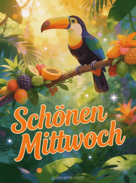 Sende einen bunten Gruß zum schönen Mittwoch mit einem Tukan auf einem Ast neben exotischen Früchten, üppigem Regenwald, warmem goldenem Licht und lebhaften tropischen Farben. Entdecke auch Schönen sonnigen Mittwoch Bilder, Karte schönen Mittwoch Küsse oder Text um einen schönen Mittwoch zu wünschen.