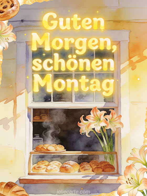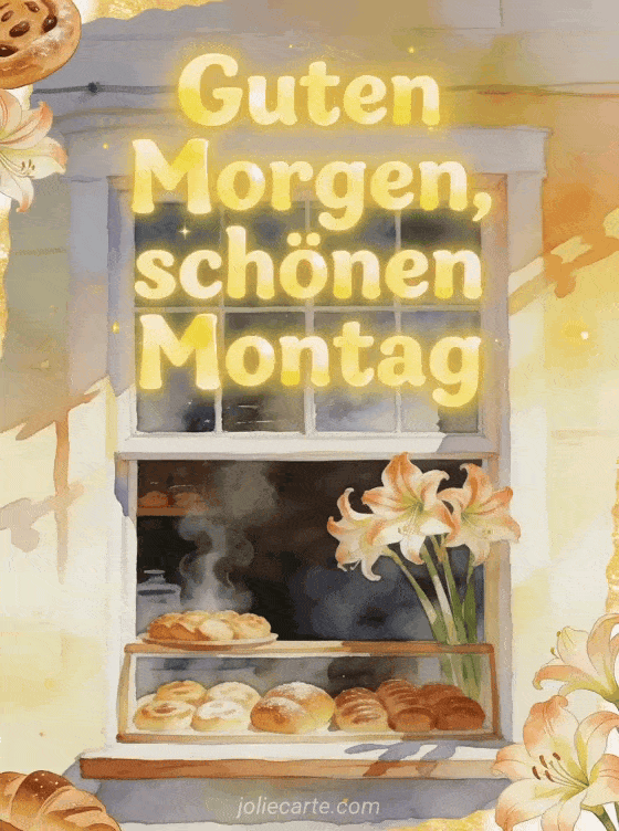 Sende guten morgen schönen montag bilder gif mit sonnengelben Aquarellbuchstaben, einem kleinen Bäckereifenster, dampfendem Gebäck und Amaryllisblüten, die über den Rand reichen. Dazu passen auch dieses Guten Morgen schönen Montag GIF, diese schöne Bilder um einen schönen Montag zu wünschen oder dieses schönen Montag Blumen GIF.