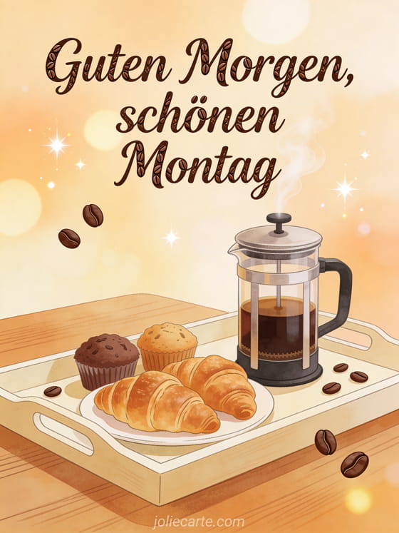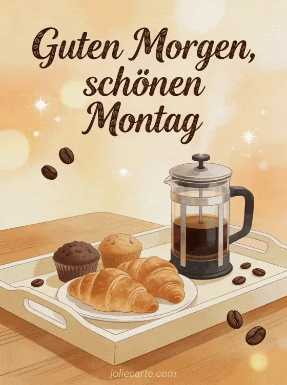 Senden Sie einen warmen Gruß für guten Morgen und schönen Montag mit Schrift im Bistrostil, French-Press-Kaffee und frischem Gebäck auf einem Frühstückstablett. Entdecken Sie auch schönen Montag gute Woche GIF, schönen Montag Kaffee Bild oder schönen Montag Guten Morgen gute Woche.