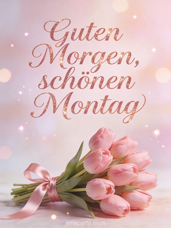 Sende einen zärtlichen Guten-Morgen-Gruß zum schönen Montag mit einem rosa Tulpenstrauß, der mit Satinband gebunden ist, roségoldenem Schimmer und sanftem Bokeh. Entdecke auch gute Woche und schönen Montag Bild, Schönen Montag Karte oder virtuelle Karten schönen Montag.