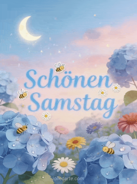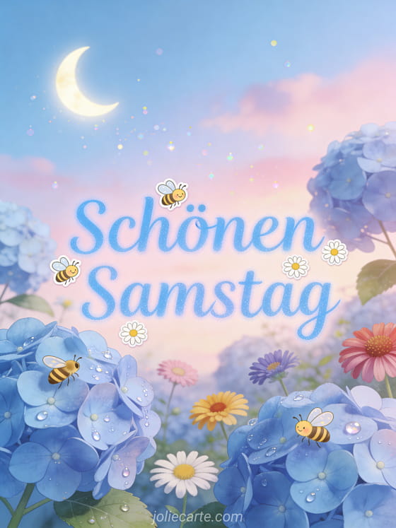 Sende einen zarten schönen Samstag mit blauen Hortensien, bunten Zinnien, fröhlichen Bienen, funkelndem Tau und einer leuchtenden Mondsichel am Abendhimmel. Entdecke auch schönen Samstag im Warmen, Guten Morgen schönen Tag schönen Samstag oder ein Schönen Samstag Küsse Bild.