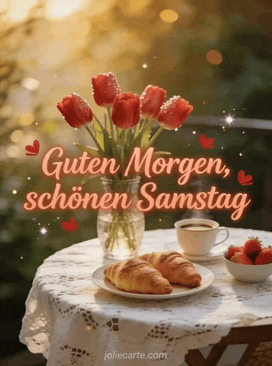 Teile guten Morgen schönen Samstag Küsse mit roten Tulpen in einer Glasvase mit Morgentau, eingebettet in eine romantische Frühstücksszene. Sende mehr Samstagsfreude mit Landschaft schönen Samstag Landschaft, lustiger schöner Samstag oder Schönen Samstag GIFs.